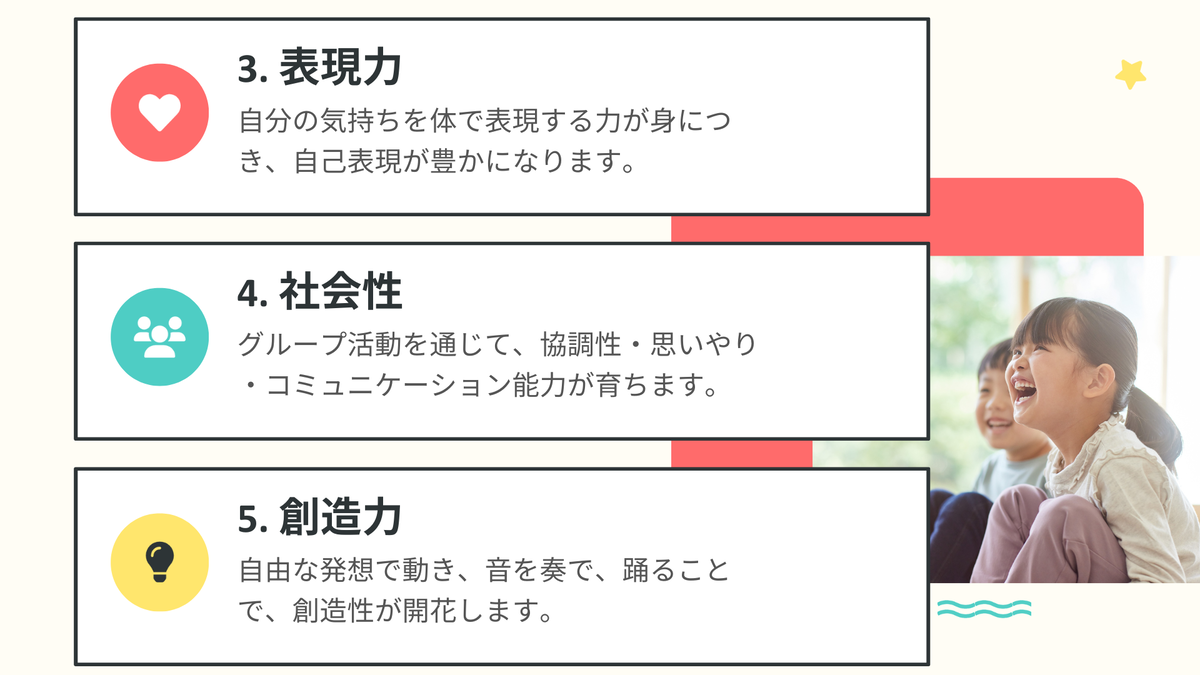 | ・キッズダンス | 表現・リズム感 |